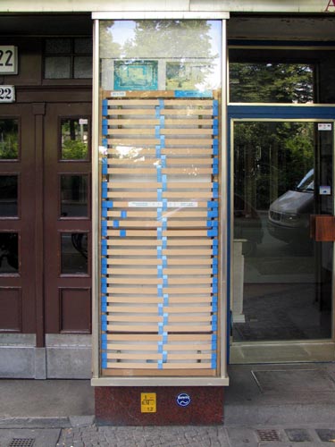 Selten sieht man einen Bettlattenrost so optimal präsentiert wie in dieser Vitrine eines Möbel Discount Geschäfts.