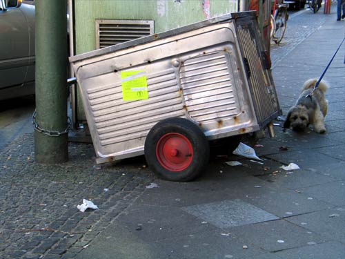 Erst auf den zweiten Blick kann man erkennen, dass dieser Fahrradanhänger kein High-tech Produkt ist, sondern aus vielen alten Edelstahl-Spülen zusammen genietet worden ist.