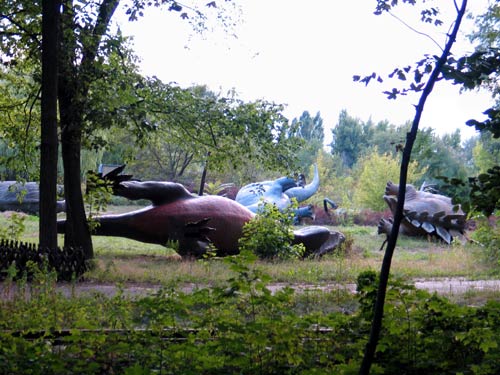 在世界各地,實體般大的恐龍模型,常常做為吸引人潮之用。這裡的恐龍四腳朝天,是為了要呈現“滅絕“的主題嗎?這個施普雷河遊樂公園已宣告破產,裡面的恐龍們之所以東倒西歪,其實是地皮無賴的傑作!